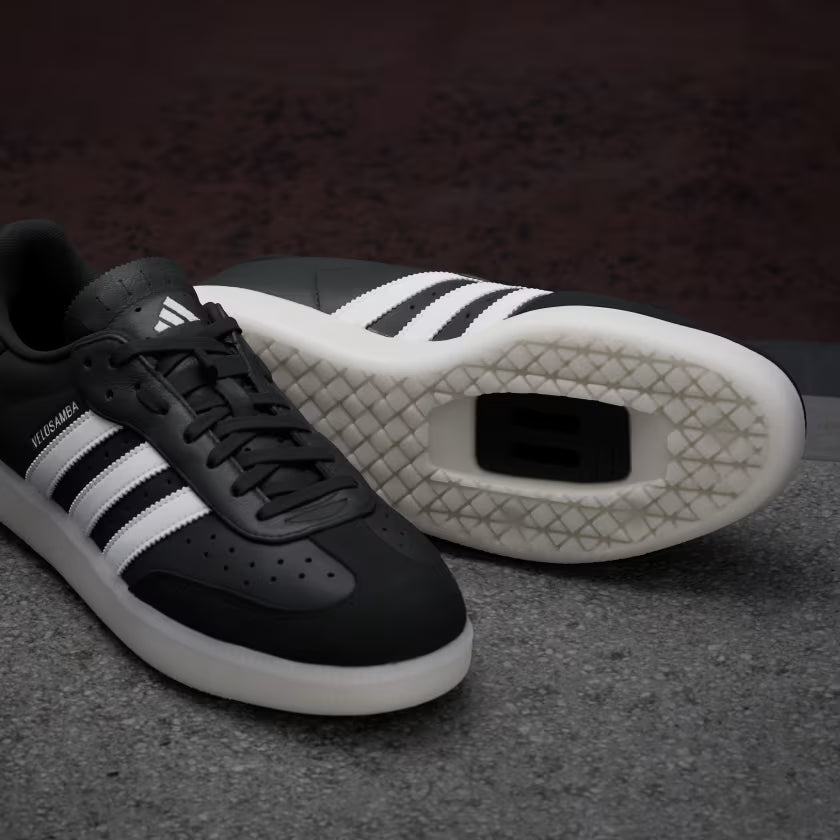 Roll from the daily commute to work day and social hour with the iconic style of the adidas Samba on your feet. Designed with casual rides and commuting in mind, the Velosamba leather cycling shoes are your incognito bike shoe. They're two-bolt cleat compatible, with a two-thirds length midsole plate that stiffens the forefoot for efficient pedaling while maintaining a comfortable, natural flex for walking. Reflective 3-Stripes details add low-light visibility. A lace bungee secures loose lace ends.